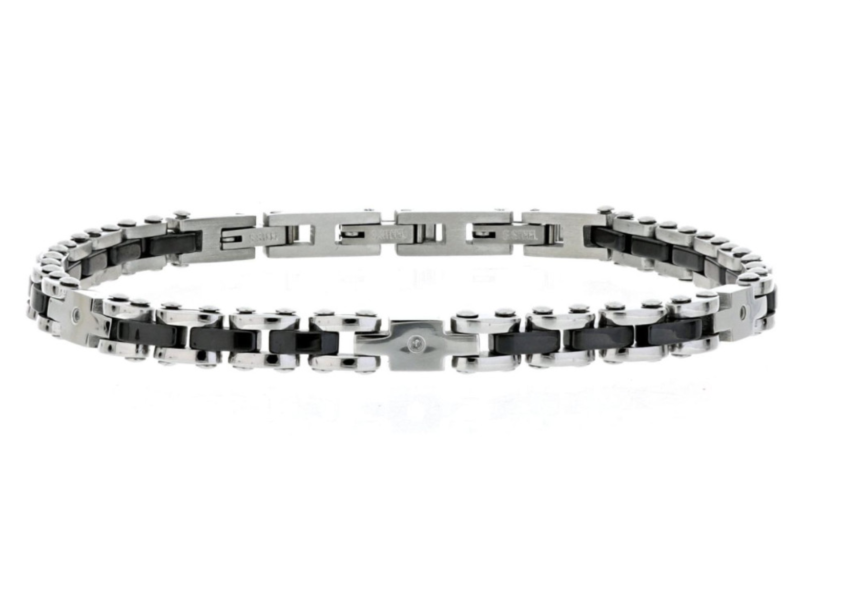 Bracciale da Uomo in acciaio colore nero e argento, modello semirigido con 3 diamanti bianchi I/SI 1 mm da 0.008 ct e chiusura a scomparsa. Lungo 18+3 cm, largo 0,5 cm. Confezione regalo e certificato di garanzia.