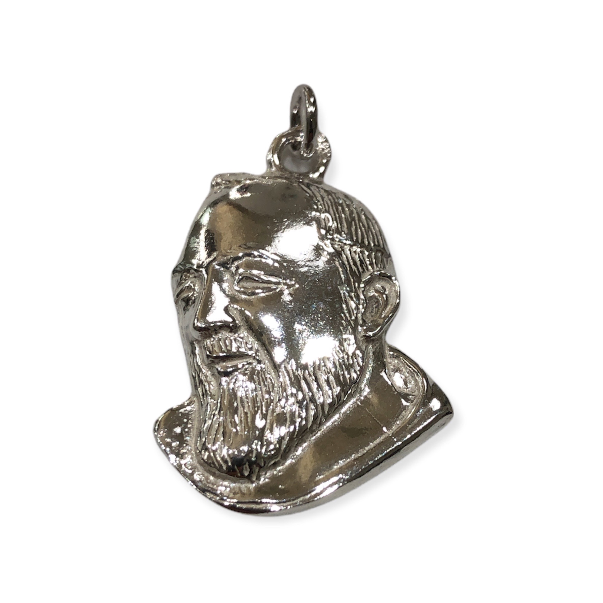 Pendente Padre Pio in argento 925%, peso 3 grammi circa, dimensioni 3 x 2 cm. Confezione regalo e certificato di garanzia.