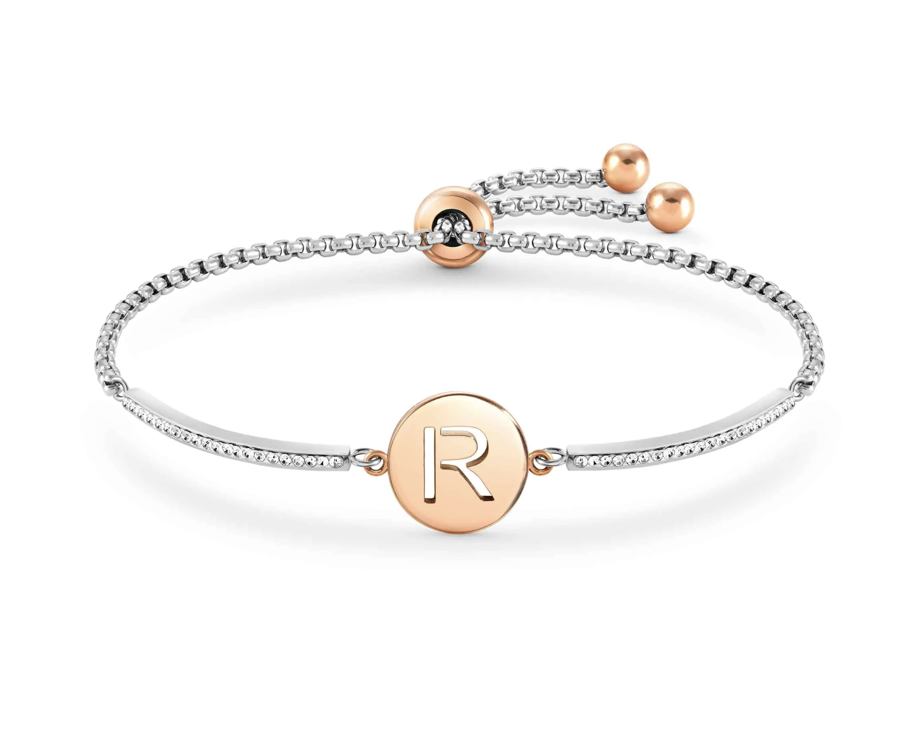 Bracciale con simbolo con Lettera R in Acciaio 316/304 anallergico, dettagli in PVD rosa e pavé di Cristalli bianchi. Lunghezza 19 cm, adattabile a 14 cm. Misura del simbolo 1,2 x1,2 cm. Made in P.R.C. Scegli l’accessorio più prezioso da indossare nelle occasioni speciali.