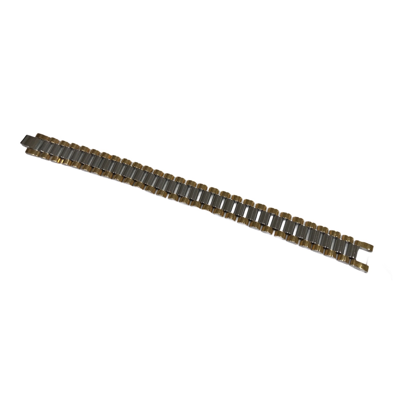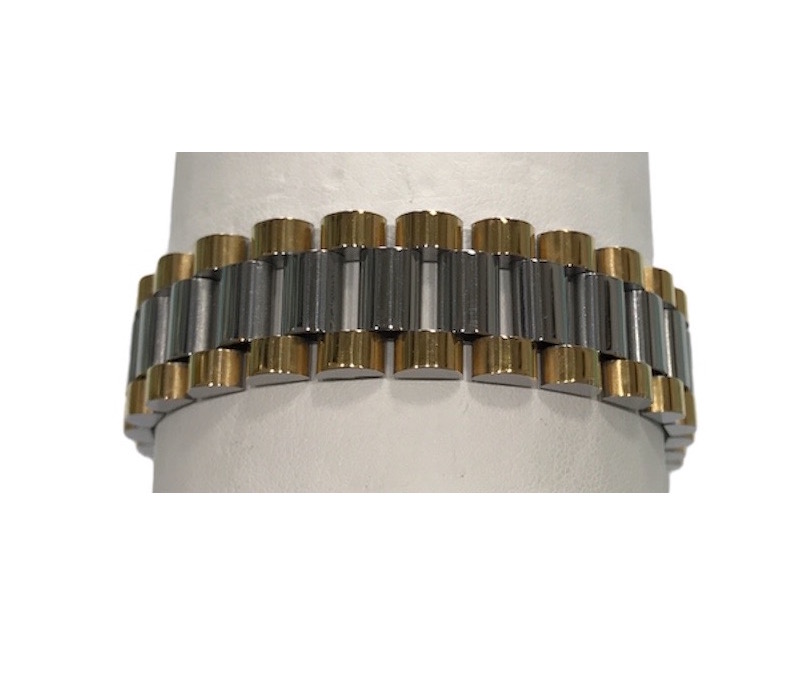 Bracciale da Uomo in acciaio colore oro giallo e bianco, modello a maglia di orologio con chiusura a scomparsa, acciaio 316L anallergico. Lungo 21 cm, largo 1,5 cm. Confezione regalo e certificato di garanzia.